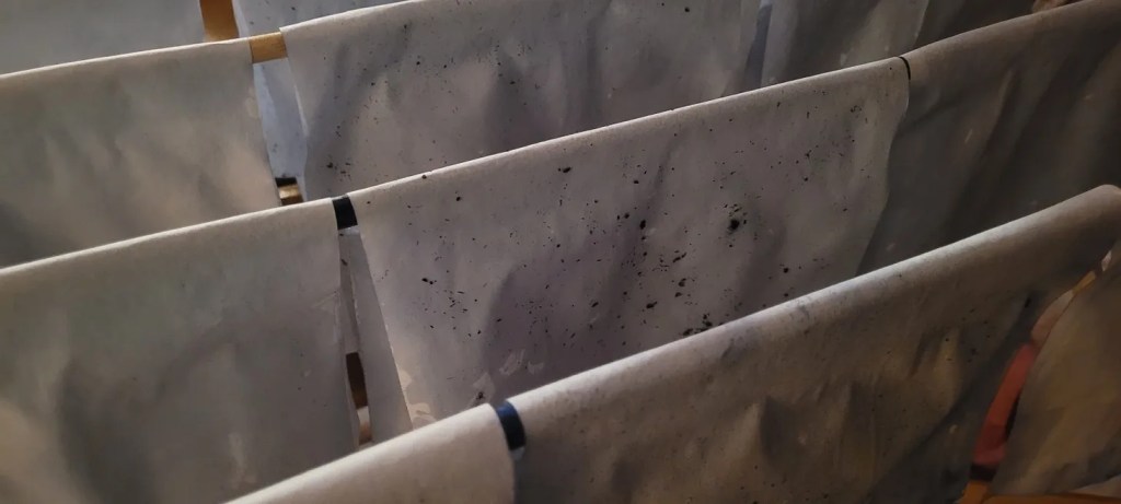 It’s easy enough to do: first I blot the pages with the wet tea bags, then I hang them to dry around the woodstove. Once dry, I iron them, though they’re never quite as flat as they once were.