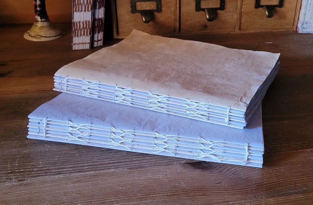 It’s the texture that captures my attention. After I discovered what was possible, I made a few of what I’m calling ‘composition notebooks’ – a few couplets of signatures stitched together without a cover, made from tea-dyed legal-sized printer paper, and alternating the two shades of colour.