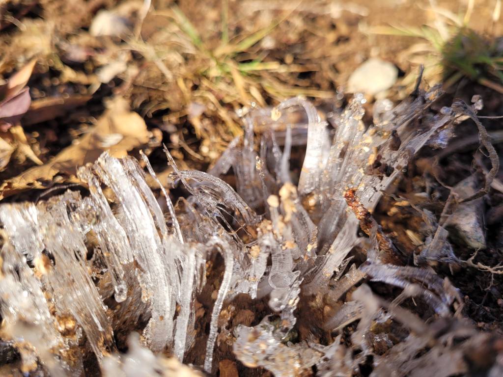 Have you ever seen needle ice? They are ice columns formed by groundwater that pop up above the soil and twist into strange ice flowers. I’ve been enjoying them during our freeze/thaw cycles of early winter.