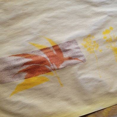 My friend Aimee set me the video that started it all, showing someone making anthotype sunprints (like a cyanotype) with turmeric and fixing it with Borax. “Huh,” I thought, “I have that in my cupboard.” Then I did some internet sleuthing to find the full recipe, which you can find here.