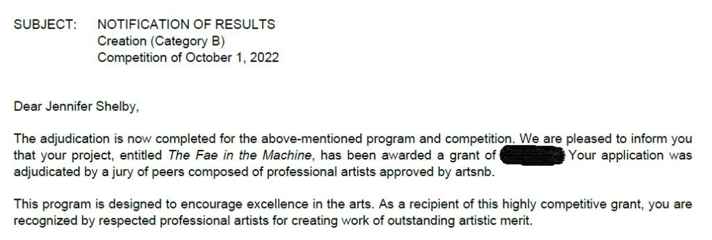 That’s what happened with my “Binding of Spellwork and Story” novel that I’ve committed to write AND received a generous grant from artsnb to do just that.
